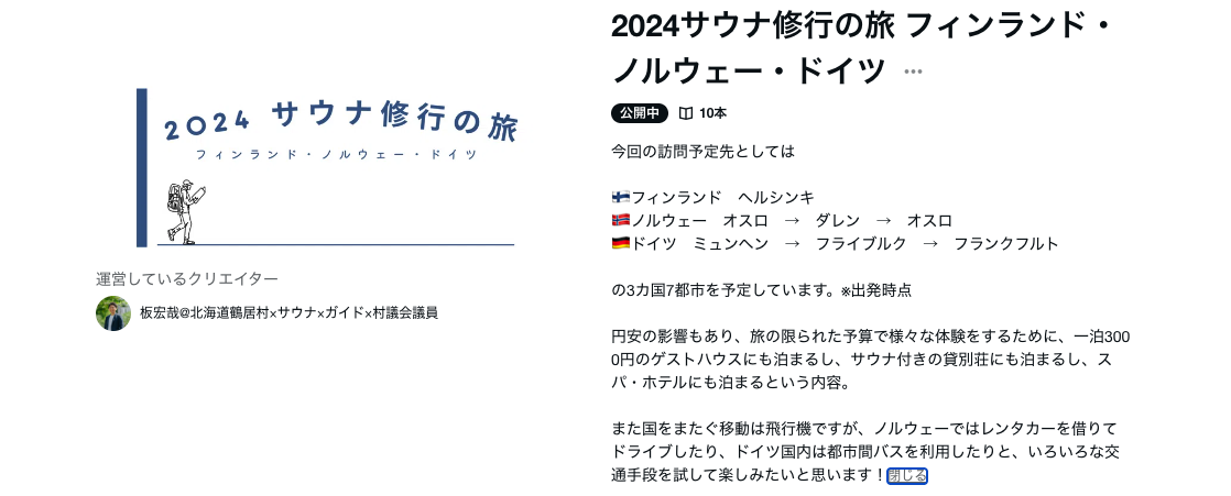 サウナが大好きで、2019年11月フィンランドへサウナ旅をする。現在は鶴居村でサウナ事業もスタートさせるほどのサウナ愛好家。